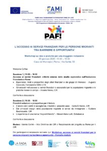 Il workshop prenderà avvio con una prima sessione dedicata alle principali criticità emerse dallo studio esplorativo sull’inclusione finanziaria a Roma. Interverranno Augusto Cocorullo della Fondazione ISMU ETS, che presenterà esperienze, limiti e prospettive degli attori finanziari (il documento integrale lo trovate qui https://progettopaf.it/2025/12/16/bussate-e-vi-sara-aperto-il-mismatch-tra-sistemi-finanziari-territoriali-e-bisogni-degli-immigrati/), e Viviana Mereu del CIR, che illustrerà gli ostacoli incontrati dalle persone migranti nell’accesso ai servizi finanziari e assicurativi. Seguirà un momento di confronto con il pubblico.